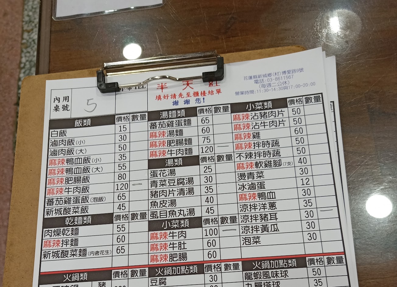 位於花蓮縣新城鄉的「半天紅麻辣館」(晚上營業至20:00)不論是鴛鴦麻辣火鍋還是酸菜花生拌麵、蕃茄雞蛋麵、魯蛋魯肉飯等餐食,價格公道,可口美味,最特別的是如果消費者點餐份量太多,老闆還會貼心的建議顧客少點一些,吃完再點,消費較多,老闆有時還會將零頭捨去,優惠給顧客,真的值得向大家推薦這家好店家!