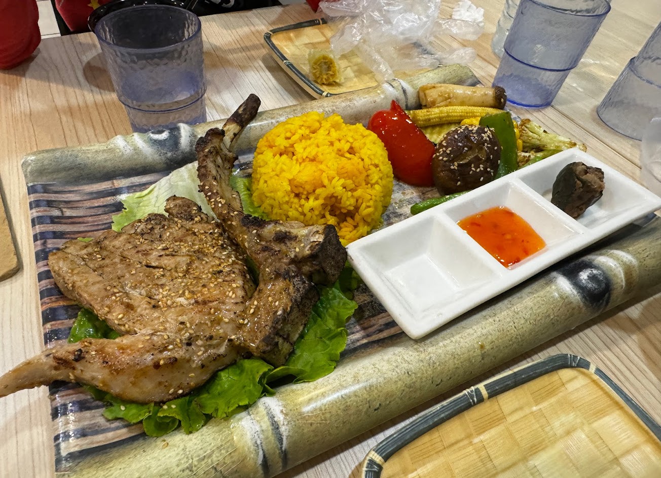 戰斧豬排手抓飯, 烤魷魚, 野菜湯, 烤雞腿排