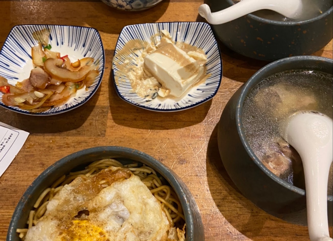 其實內部座位蠻多的,所有沒等很久就輪到我了,我今天點了炒麵+半熟蛋$45&鳳梨雞湯$65和蜜香豆干$30,這樣總共$170,以晚餐來說有點小貴,不過份量真的很夠。炒麵的部分,一開始很擔心說上面會不會有很多肥肉,本身不太敢吃肥肉,幸運的是端上來看起來還好,份量比我想像的還要多,加上那個半熟蛋,不過我覺得好像有點稍微過熟了一點,蛋黃沒有很明顯的流出來,不過味道還是很足。