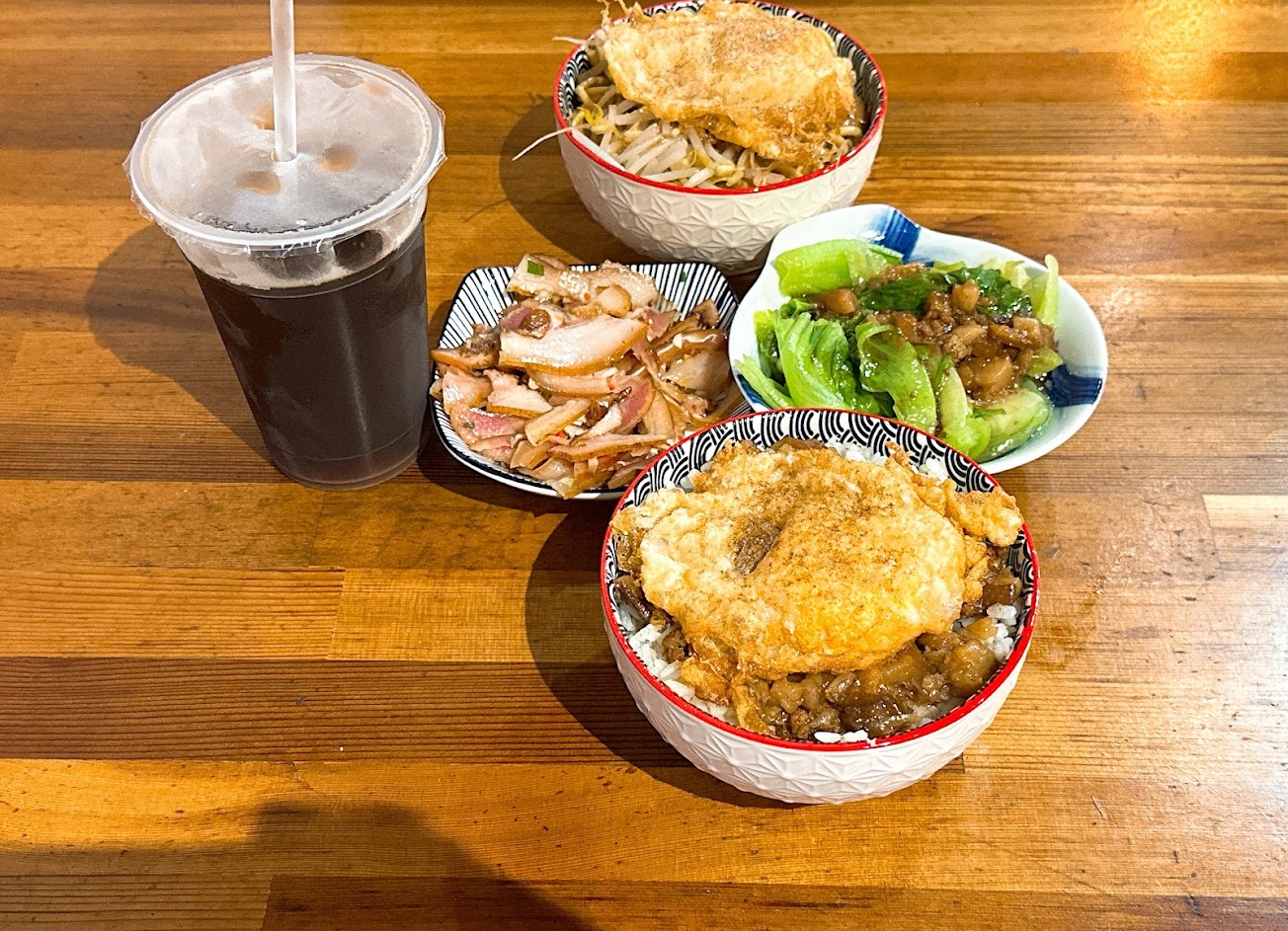滷肉飯 加蛋, 胡麻豆腐, 滷肉飯加半熟蛋, 蒜味豬頭皮, 炸蛋滷肉飯