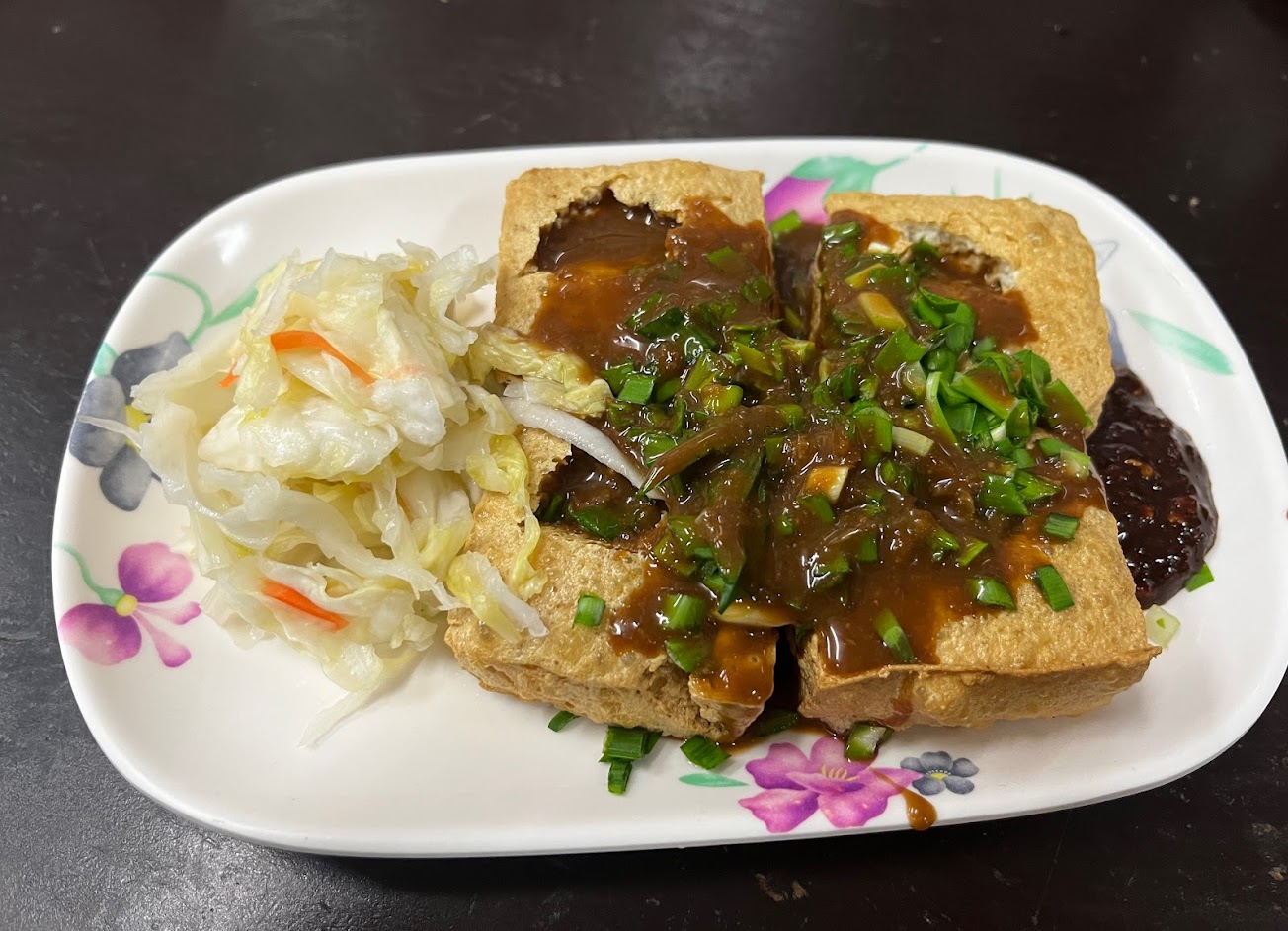 外酥裡嫩,完全是一個好吃臭豆腐該有的表現,外面澆的醬汁不會很鹹,搭配酸酸的泡菜非常開胃,很特別的是上面會撒韭菜,並且臭得很舒服?