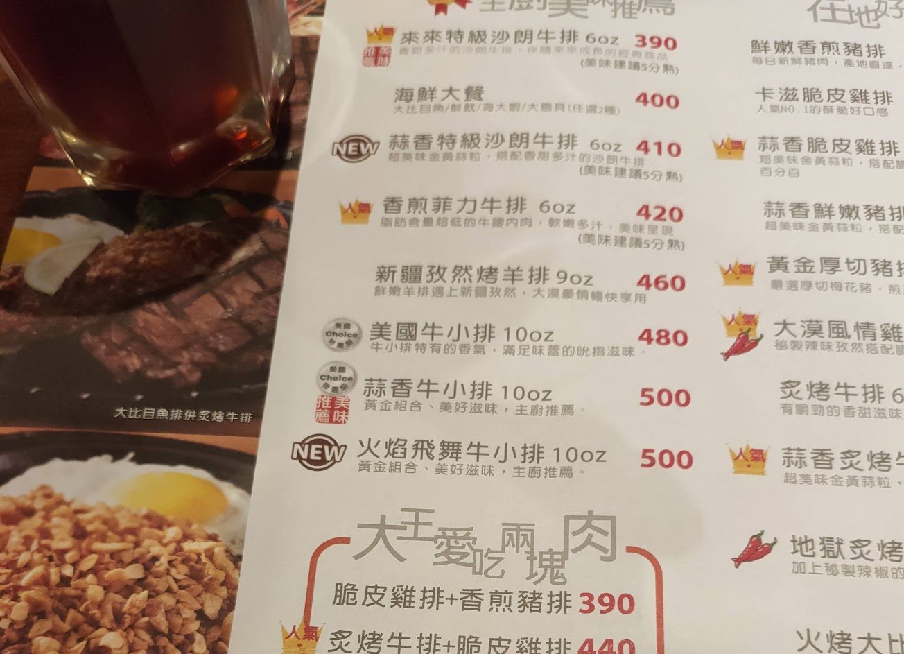 餐點都好吃?服務人員都很好? 服務 內用 餐點類型 晚餐 平均每人消費金額 $200-400 餐點:5 服務:5 氣氛:5 建議的餐點 餐前沙拉, 焦糖烤布蕾, 珍珠仙草凍, 蒜香脆皮雞排 停車位 不確定 附近的停車場 免費停車場, 免費路邊停車 停車場 來來牛排對面