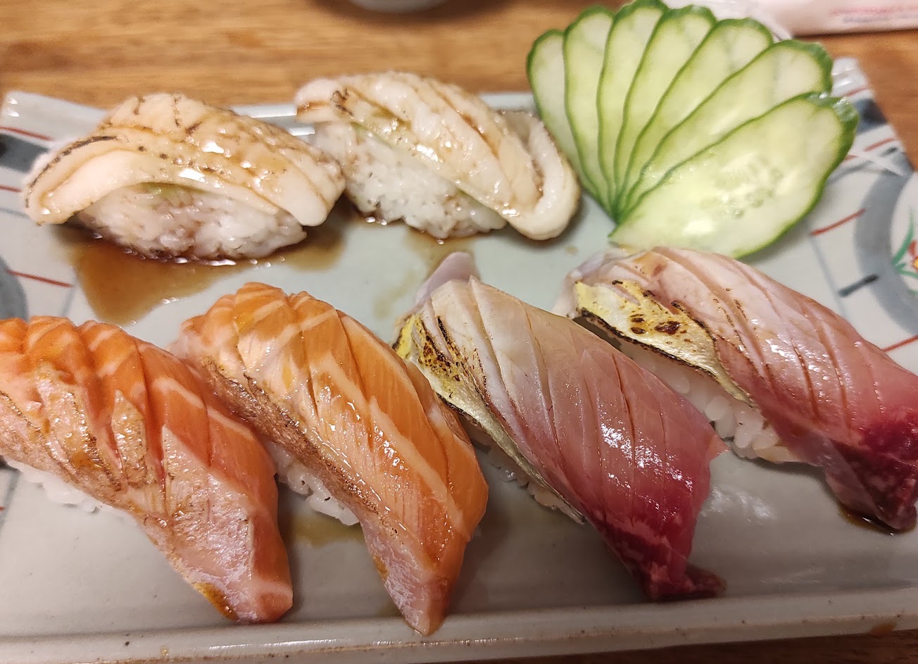 鮮魚湯裡的魚肉給的滿滿的很大一碗 炙燒鮭魚握壽司好吃到爆炸 炙燒的香氣很棒、魚肉本身入口即化 我是真的第一次知道什麼叫做入口即化,以前都覺得是別人太浮誇,來附近玩真的要去吃一次看看 然後雖然google上說營業到晚上八點,但實際上就是賣完為止,像我今天去,他6:30就貼完售在店門口,所以想吃真的要早點去??我們剛好已經是最後幾座客人了很幸運吃得到,有些人是直接撲空?