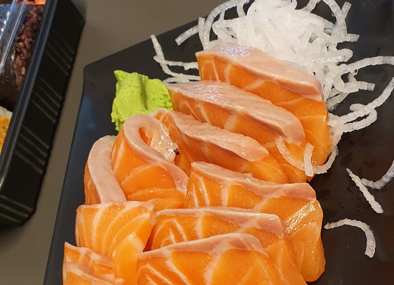 3.餐點只剩下鮭魚類還可以,一樣份量十足。但是握壽司的醋飯、醬油調味都很甜。山葵醬根本沒什麼味道也不嗆。我們點的海苔壽司直接從桌旁的外帶冰箱裡拿出來用外帶盒呈上桌,其他的壽司卻可以用餐盤呈上,讓人覺得敷衍了事。壽司類非常普通算不上好吃,完全不必點。