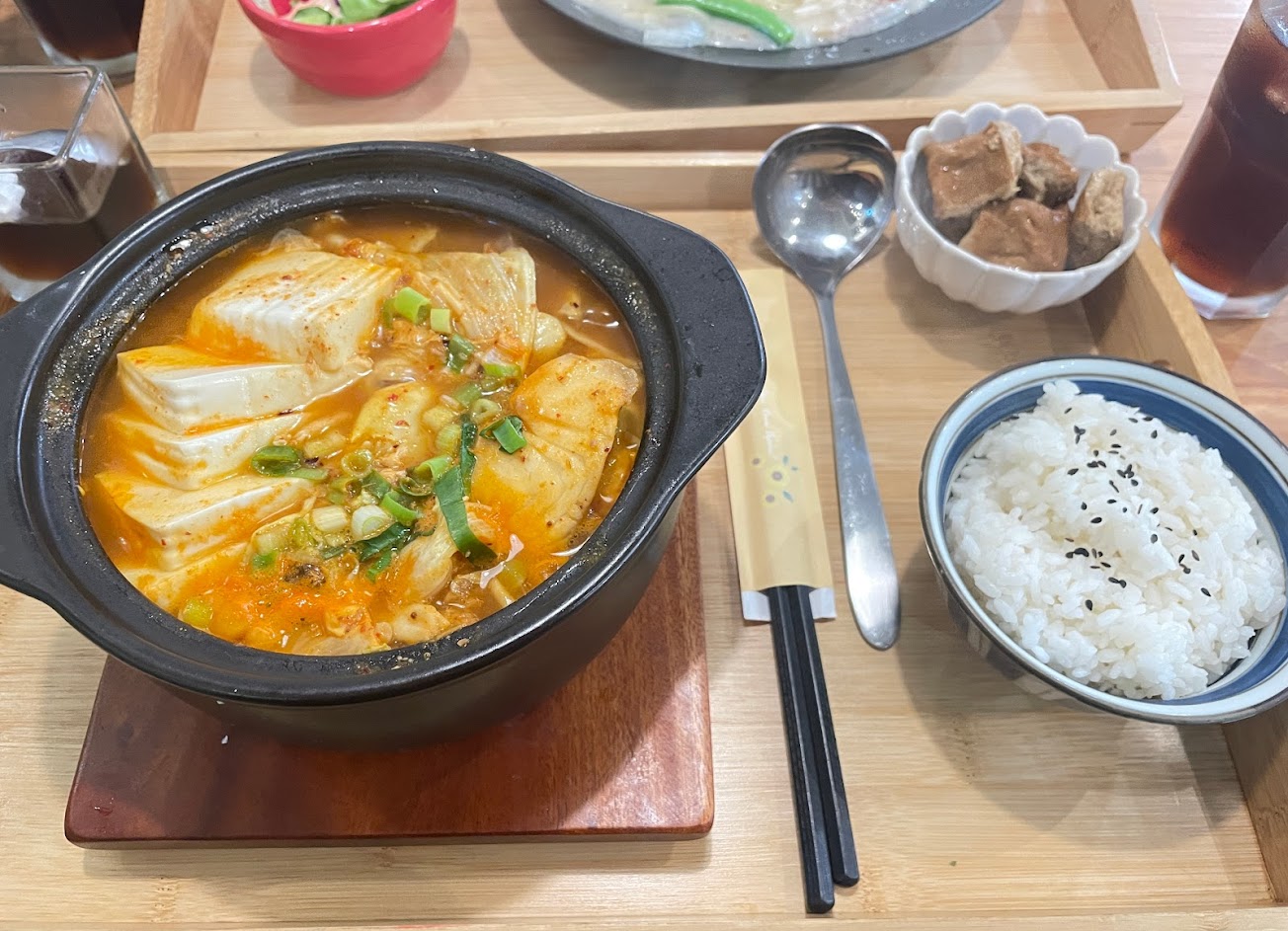 泡菜豆腐鍋湯頭濃郁,料多(有豆腐、泡菜、菇類、丸子類、年糕、蛋、菜),酸辣程度剛剛好,很中規中矩的韓式料理,好吃👍