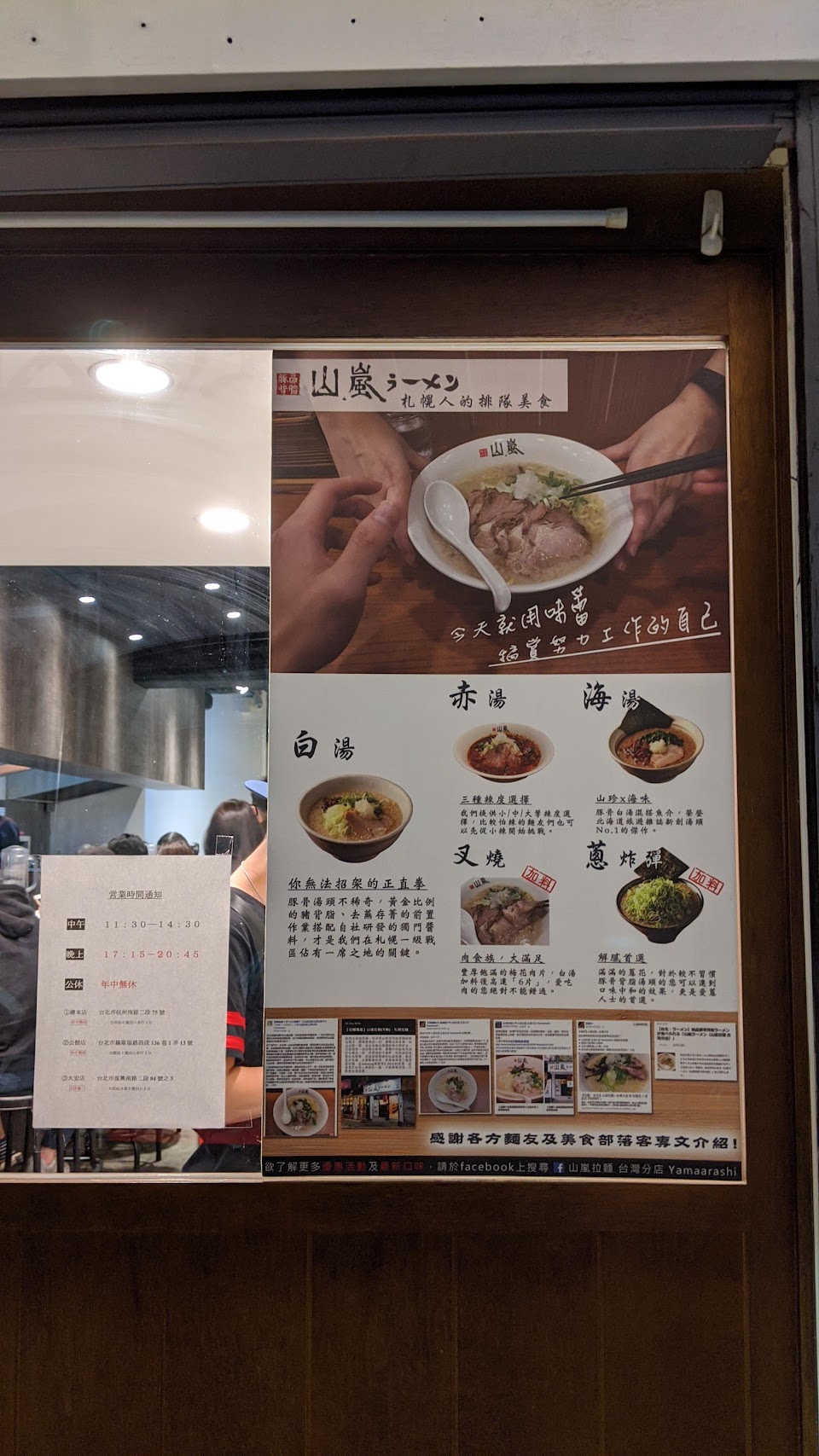 冷天在公館想吃拉麵,特別找到這家評價破高的山嵐,到門口正要開門營業已經排了幾位客人,發現還是連鎖店的二店。服務生很細心,看見我坐在門口候位區還特別出來關心詢問,排到位先在販賣機購買餐券,菜單種類單純只有麵類跟加料選項,湯頭共3種白湯(豚骨原味)/海湯/赤湯(辣味),入座後會再詢問麵的硬度和油量等偏好,約等5-10分鐘就出現熱呼呼的拉麵,湯頭味道正統又濃郁,最讓我驚豔的是叉燒肉,堪稱是目前吃過肥瘦最均勻又超軟嫩的叉燒,連小孩也能輕鬆咀嚼! 大加分~~建議油量不要加太多,30%~50%的湯汁比較順口好喝喔,座位雖不多但每個位子都很寬敞還有設置放包包的掛勾,是一般拉麵小店中比較難得的心思! 若能供應多幾樣小菜就更完美了!