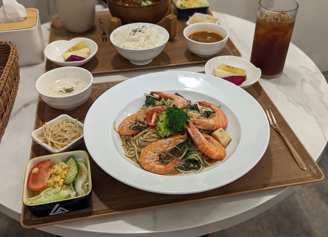泰式椒麻雞的味道麻大於辣、滿新鮮的口感,義大利麵(缺圖)白醬不會濃稠、走清淡路線,餐點整體感覺還不錯。