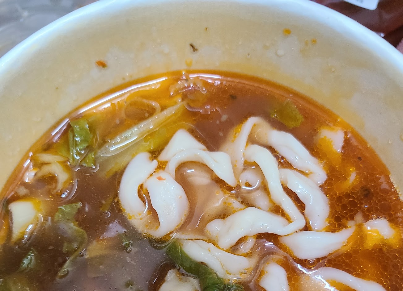 麵疙瘩是球狀 像是紅白湯圓的大小 吃起來是水晶餃的口感 不是傳統帶著Q勁與麵粉味的 不是很喜歡