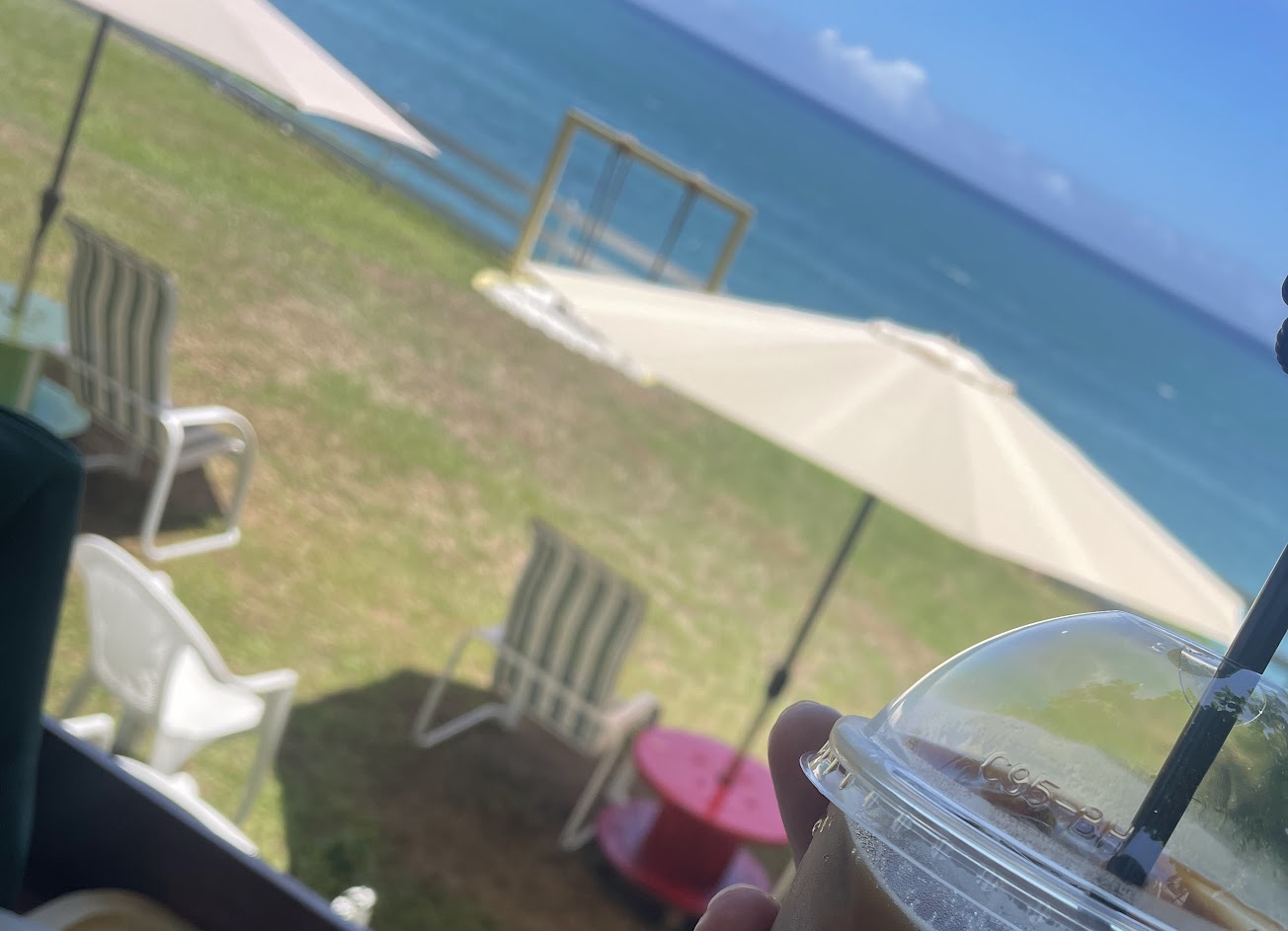 好天氣來到這裡放鬆 喝著飲品、吃著炸物 看著藍、綠相呼應的海岸線 藍天白雲的襯托下