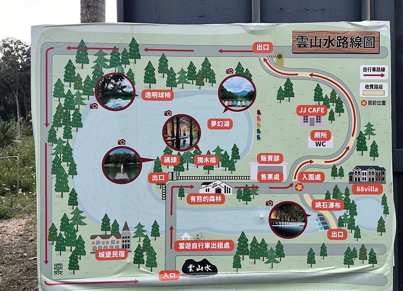 整個雲山水感覺像是一整區的山莊別墅,有私人住所,也有餐廳、民宿等,其中植物農場也包含在其中,朋友說之前入場拍照是不用錢的,但現在要收費囉!全票每人120元,另外會提供一張50元的折價券。