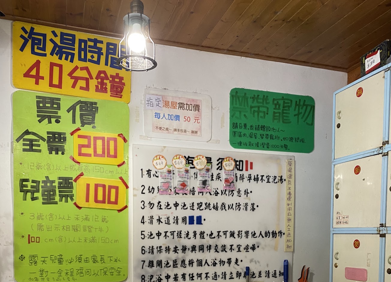 晚上1800~2240大眾池,三個不同溫度熱水池,一個低溫山泉水,一個有滑水道的常溫泳池,早上0700~0900有中西式早餐。