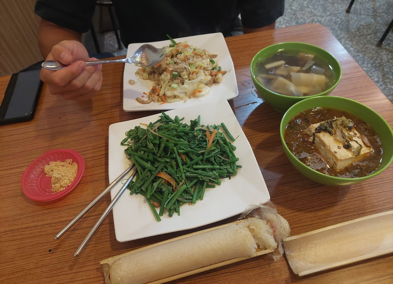 點了 竹筒飯 高麗菜 山豬肉 蘿蔔糕 三鮮湯麵 竹筍湯