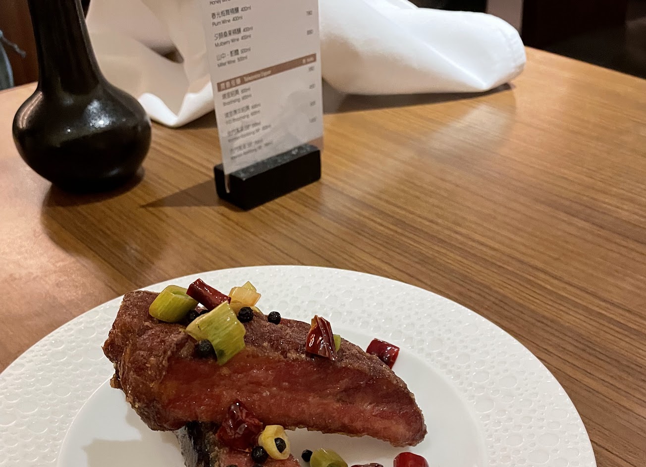 馬告椒鹽排骨,很大塊的排骨肉,咬下能感受到外皮酥脆的口感,可惜的是吃到第三口,就有比較重的油膩感。