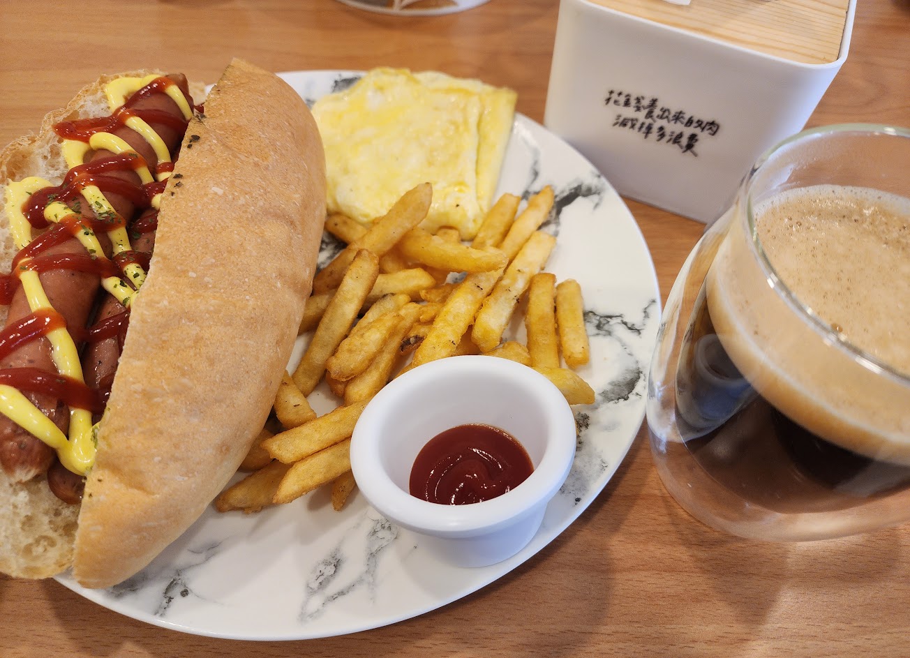 套餐分量非常足夠,大亨堡”兩條”德式香腸搭配店家的醬汁完全不馬虎!脆薯炸的也剛剛好沒有油耗味!搭配散蛋加上鮮奶茶這樣的一餐完全對得起這價格!只能給讚?