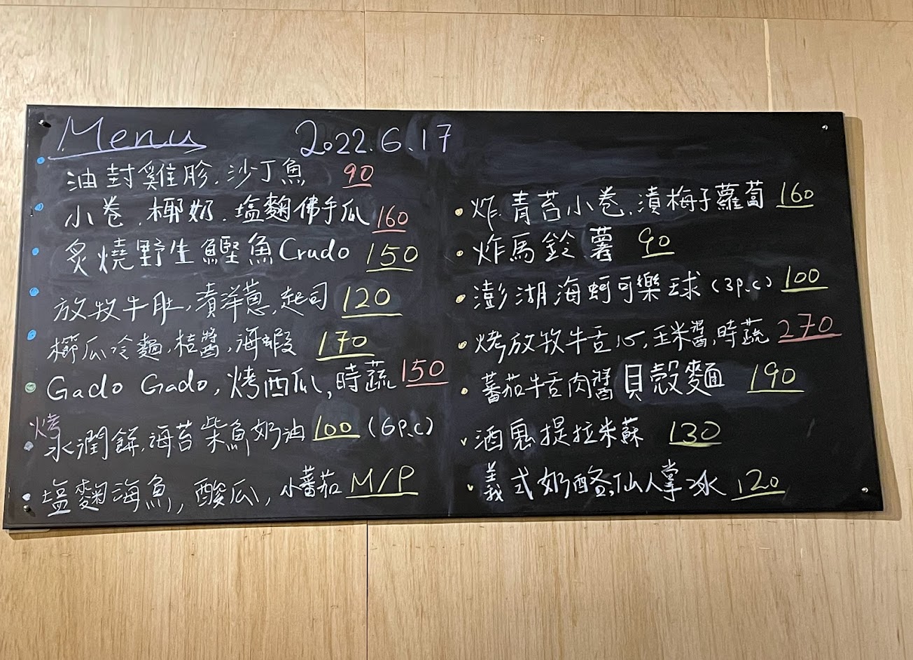 店很小所以請你們不要來跟我擠,這次沒吃到提拉米蘇,所以就有了可以再來一次的理由了。 老闆很用心介紹每一道菜,每一種搭配都讓我覺得新奇很有嘗試的慾望,看似不搭的食材經過老闆的巧思搭配在一起卻一點也不顯衝突,每一口都吃得津津有味。 竟然能在澎湖吃到我小時候常吃也愛吃的水潤餅,搭配臭肉魚醬有多層次的風味,連麵包盤都讓我驚艷! 風茹康普茶(我忘記實際的名字了),好好喝飯後來一杯好解膩,黑板上的菜真想每一道都來一份,可惜還要趕著搭機,我會再來的?? 服務 內用 餐點類型 晚餐 平均每人消費金額 $800-1,000 餐點:5 服務:5 氣氛:5 建議的餐點 烤魚, 櫛瓜麵草莓沙拉