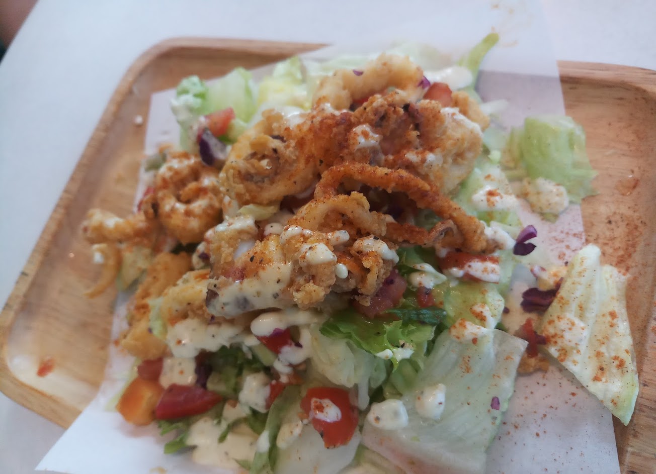 原本逛夜市路過發現生意超好、超多人。有一樓二樓全坐滿(花火節人也多啦!) 看到門口超多美食節目推薦,心裡想著一定要來吃。 隔天中午來嚐鮮(11點營業),我和男友點了宇宙無敵海鮮堡和香料炸雞墨西哥捲,食物真的很美味!炸雞雖然不是那種超厚的炸雞,不過肉也很夠(不是那種一咪咪的肉然後粉很多),外頭粿著一層薄薄的炸皮,增加了炸雞的香味。最上頭有兩大塊肉,店員還教我們先吃一塊雞肉後,另一塊再DIY用墨西哥餅皮包起來吃。不得不說,單吃肉美味,包著炸的酥脆的肉、生菜沙拉和薄薄的餅皮一起吃更是別有一番風味。