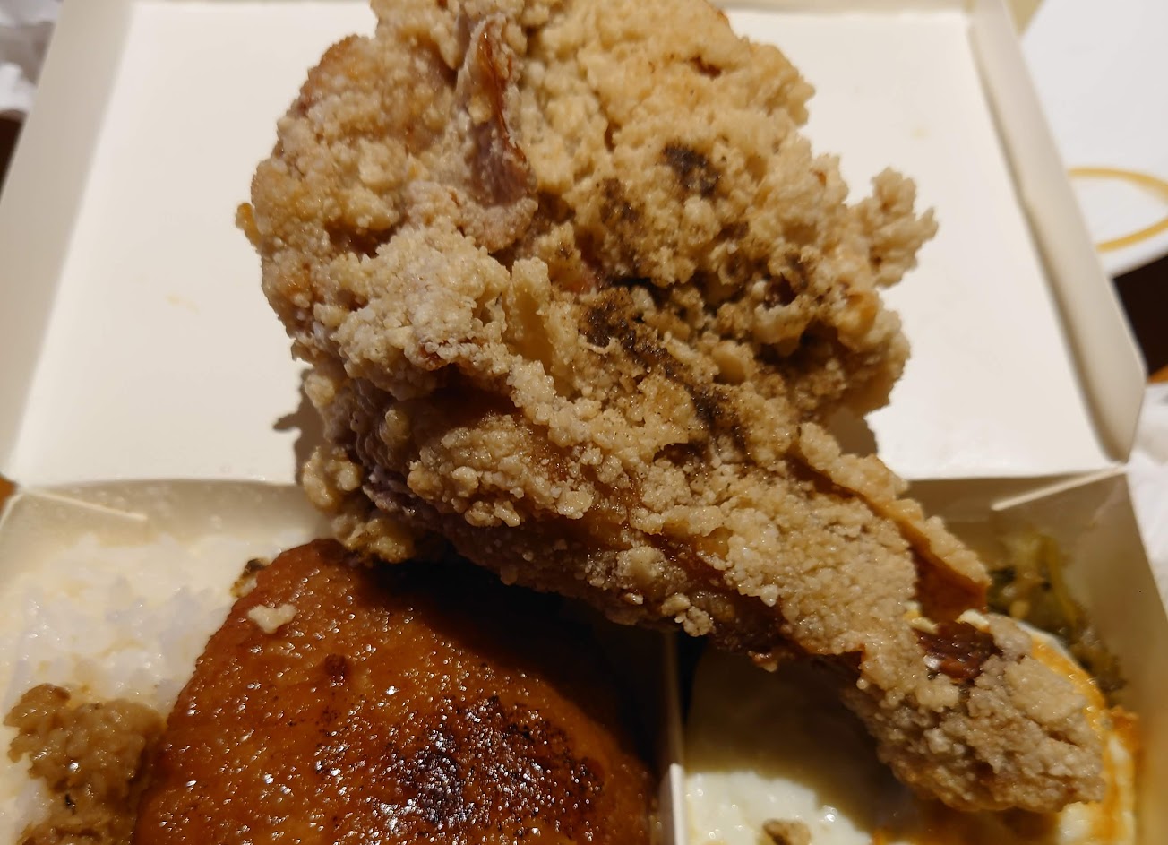 空氣不流通異味蠻重的,讓人想趕快離開,飯裡面沒青菜只有一樣酸菜和荷包蛋做配菜,一片手掌心大小的豬肉片和棒棒腿125,豬肉片口味偏甜,普通沒記憶點
