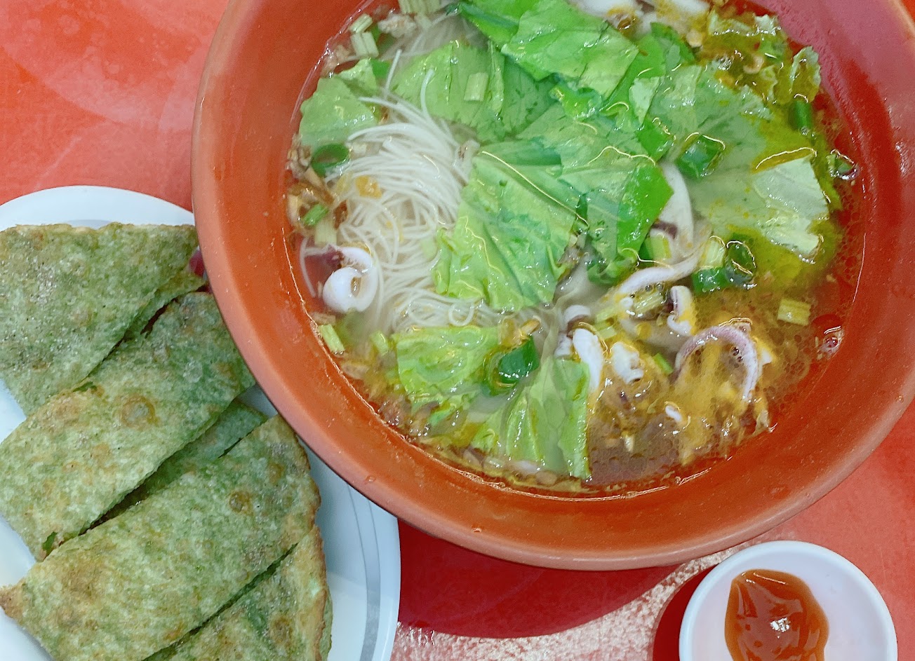 大推干貝小管麵線跟海菜炸餅!注意干貝小管麵線是微辣風味十足
