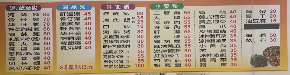 看似簡單的切仔麵小吃店,老闆娘很用心準備各式小菜,口味鹹淡適中蠻好吃,海鮮麵湯頭甘甜清爽。
