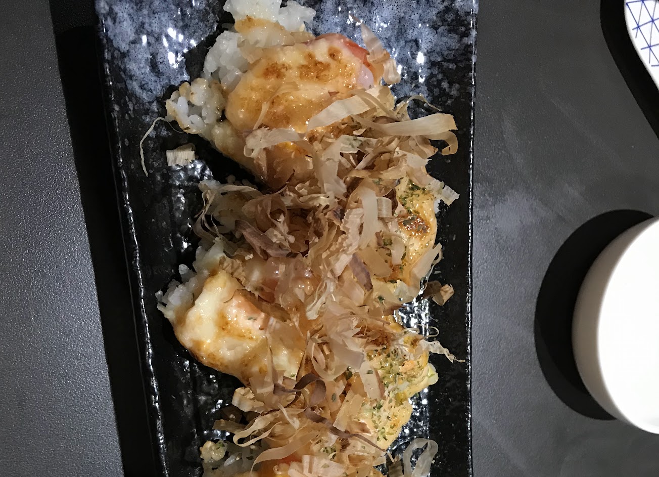 考飯糰:很特別的是上面的明太子醬,很特別,飯糰烤的外皮太薄,口感太像米飯了,比較不像烤飯糰