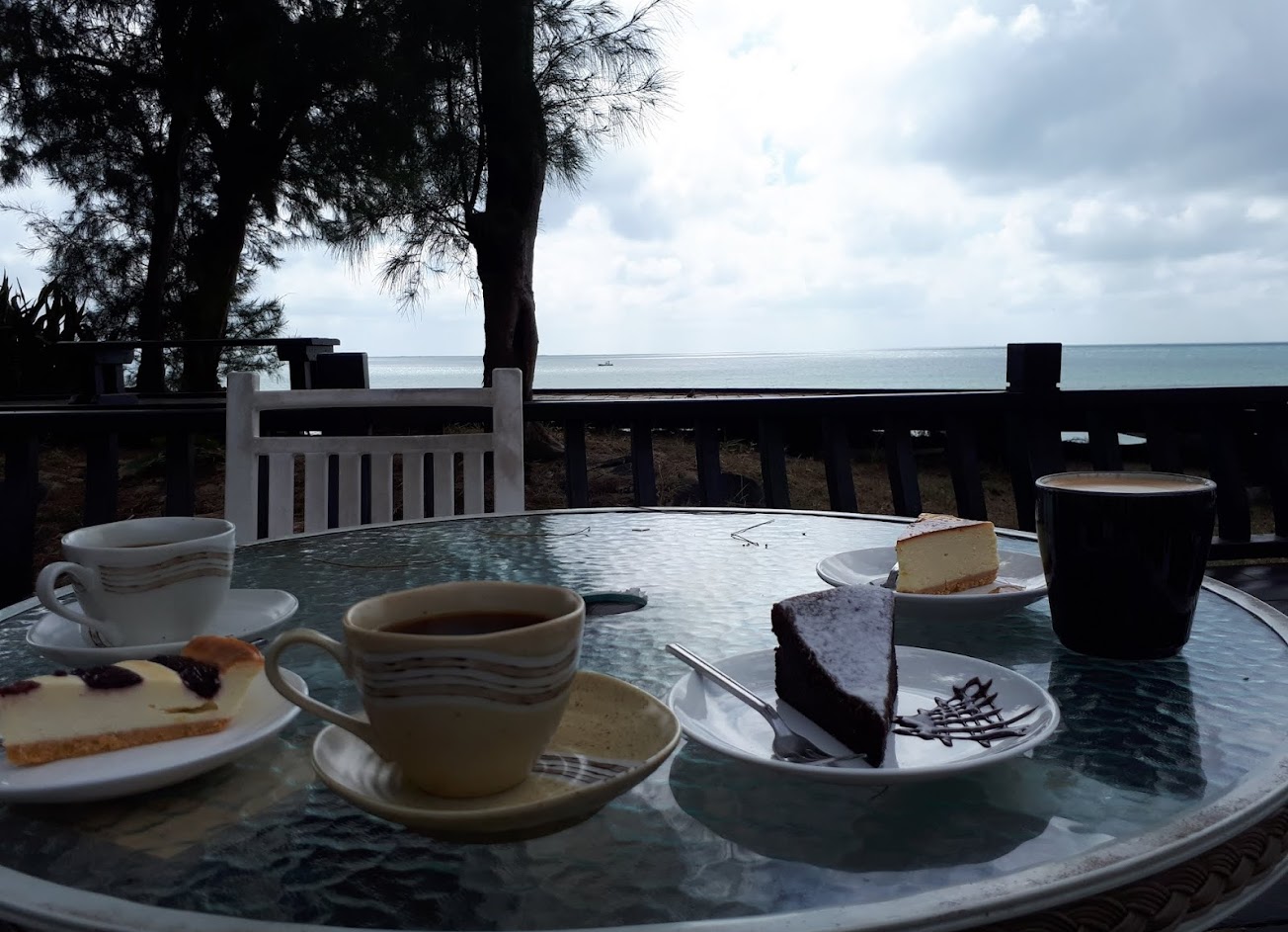 這片海很漂亮,望著大海喝咖啡很愜意,但有貪吃的橘貓來打擾我吃巧克力蛋糕,平均一口要花15塊,被橘貓打擾只能快速吃完沒辦法細細品嚐
