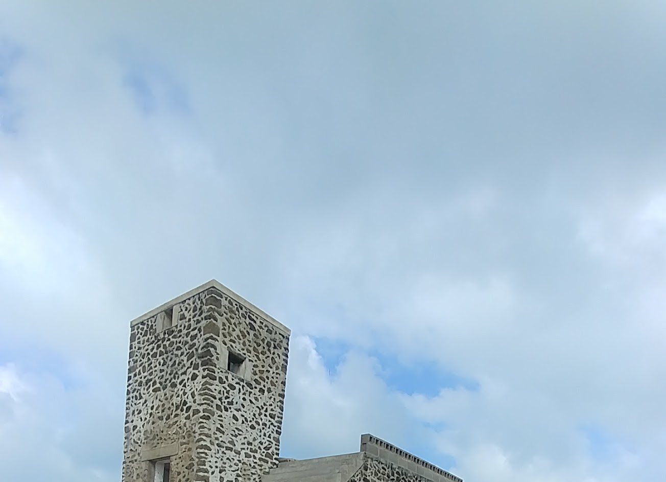 一座外觀宛如古老碉堡的建築,靜靜地矗立在蔚藍海岸邊。