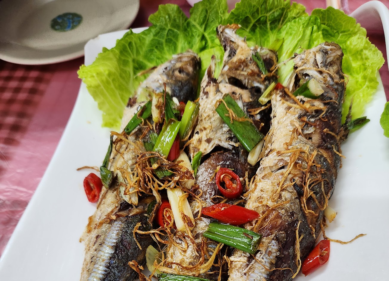 當地人推薦的海產店,第二次來了。在派出所隔壁,店雖不大,但乾淨。中午不休息。老闆娘會耐心協助點餐。老闆很懂魚,用餐同時一邊用牆上魚月曆解釋餐點的魚種與特色,看得出老闆對魚的熱情,很有趣,順便長知識了。這次2人造訪點了炒水蓮、薑絲煎小管、飛魚卵煎蛋、炸紅尾冬(限量隱藏版菜單,每年只有一個月吃的到),蛋炒飯、1250ml蘋果西打1瓶。全部一共870元。熱炒店的價格,但餐點卻很有質感和水準,水蓮不軟爛。小管軟硬煎的恰到好處,不會太生又不會太乾,有點鹹香,整盤連薑絲都可以吃光光。煎蛋上撒了很多飛魚卵,啵滋啵滋又Q彈。當地現流,出生一個月內的紅尾冬,肉質不乾澀、飽滿,吃起來超涮嘴,份量超多,一盤吃不完打包回家配啤酒,闆娘還不忘貼心附送一包胡椒盬。