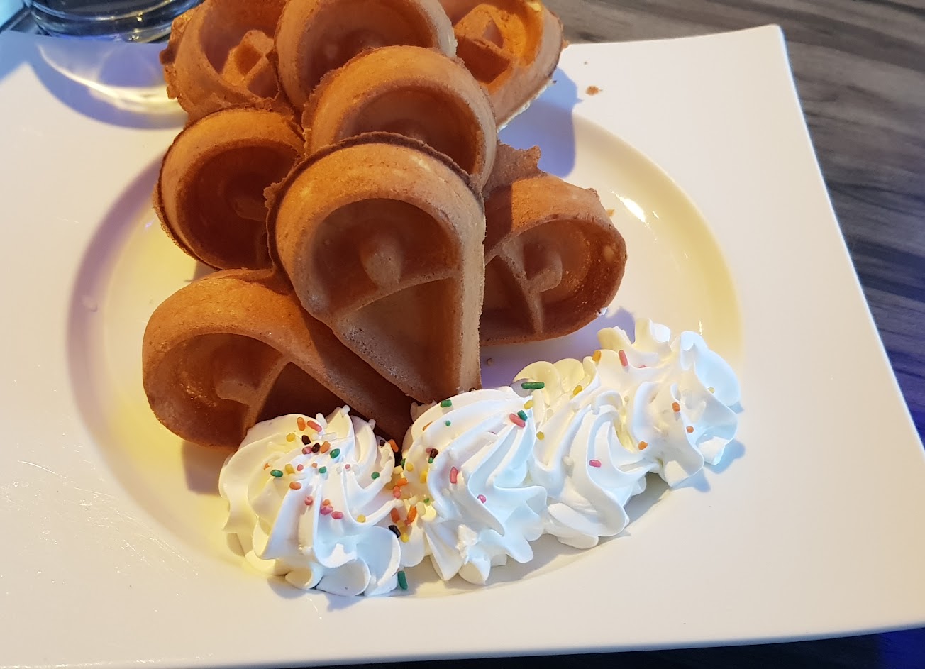 餐點普通,第一次吃到鬆餅烤焦還缺角就送上桌。