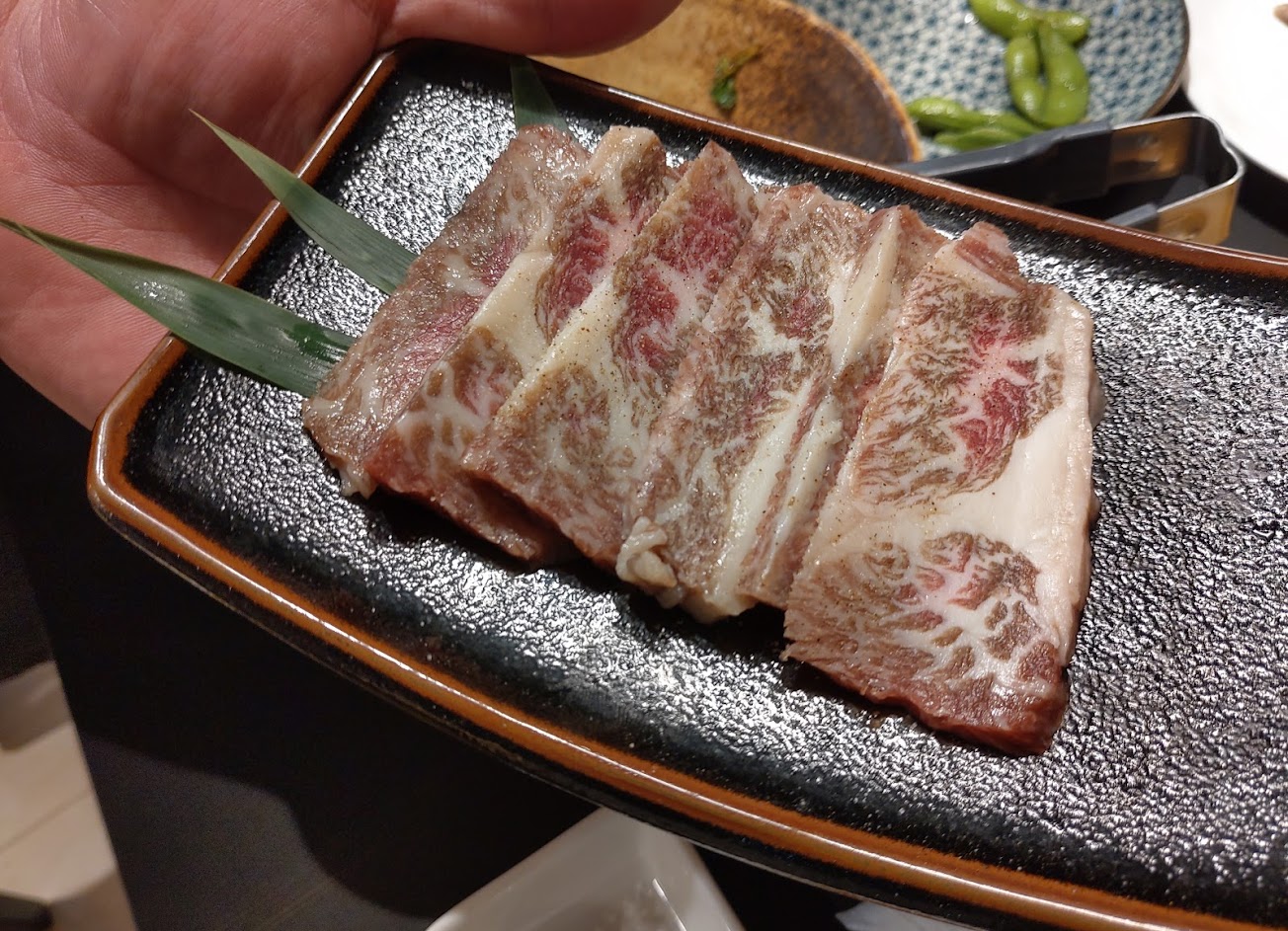 店家提供三種調味,日本伯方鹽/沖繩檸檬醋醬/偏甜燒肉醬,和牛燒肉配上晶瑩剔透的白飯,相當好吃。我們另外點了炙燒比目魚捲和胡麻豆腐,比目魚捲是注重整體清爽的類型,能明顯感受到蔬菜的爽脆,即使一口吃掉一個,也不會感到負擔。雙層胡麻豆腐,中間夾了一層香鬆粉,吃起來脆脆甜甜的,挺有趣。最後,套餐的蔬菜,似乎特別挑選過,烤過之後,非常的清甜。和牛燒肉就不用多說了,這是一家值得來拜訪的和牛燒肉居酒屋店!