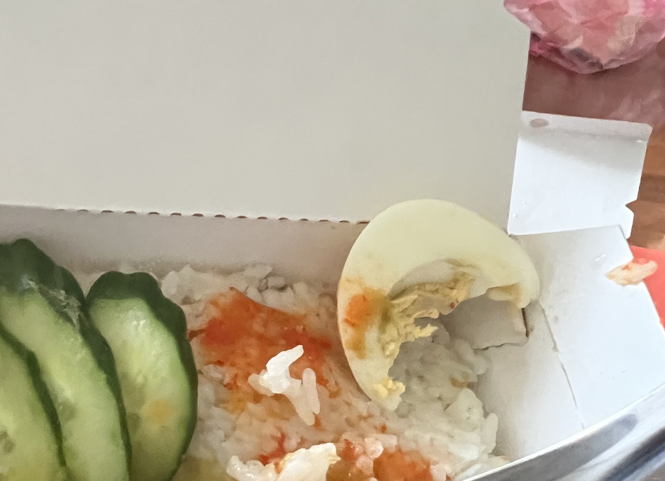 蛋有蛋殼、醬料包放在食物上、米飯濕黏難吃。