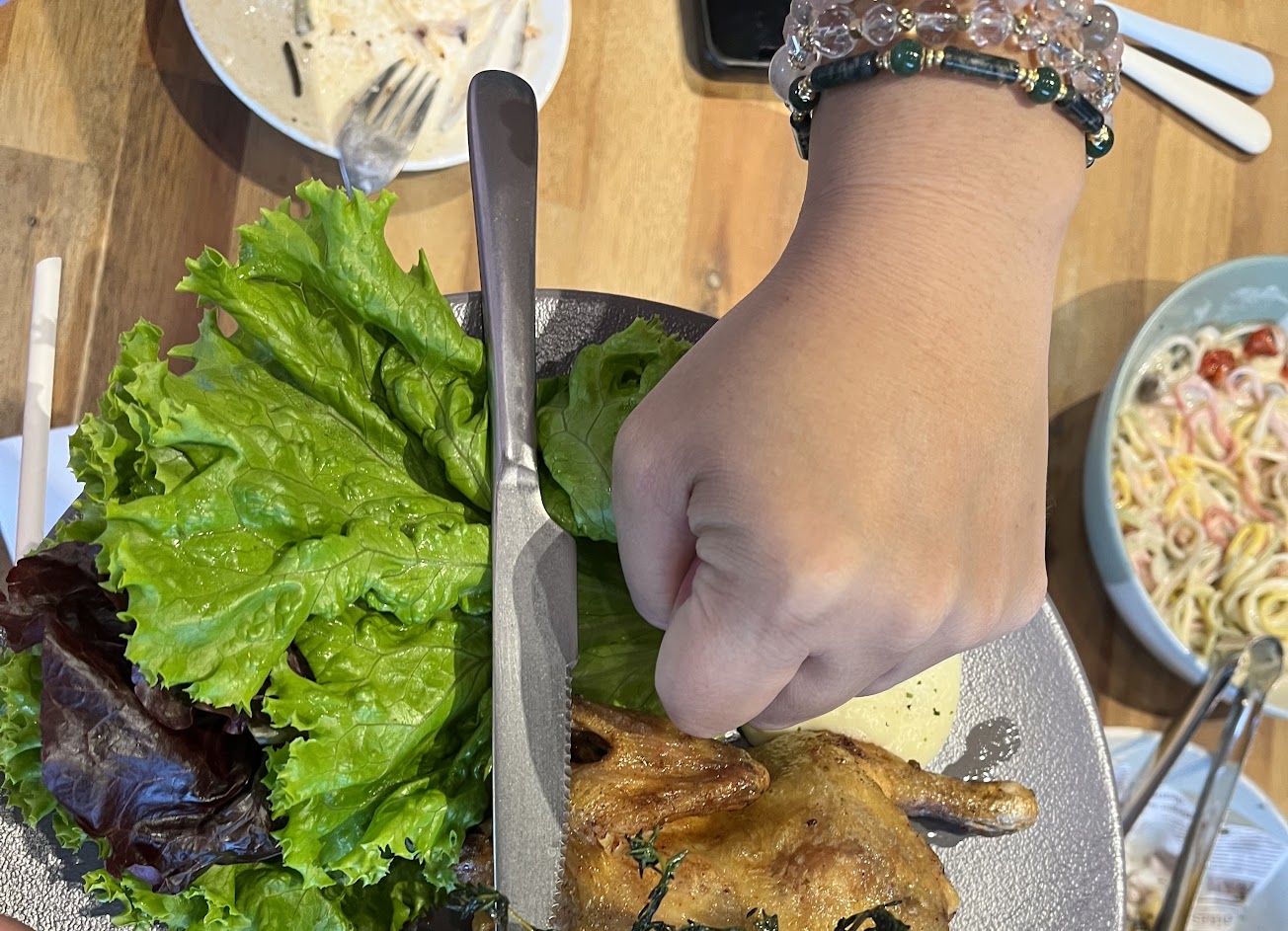 餐點口味普通價格偏貴:烤雞520但是超級小隻,比拳頭大沒多少,旁邊的葉子也比烤雞大片,這擺盤上菜時大家都傻眼了。兒童餐彩虹麵口味太清淡,大人小孩都嫌沒有味道。其他點了墨魚麵、小卷披薩,味道還不錯,小卷也不少,算滿意的;松露薯條也不錯,漢堡份量可以但是肉片又乾又硬。