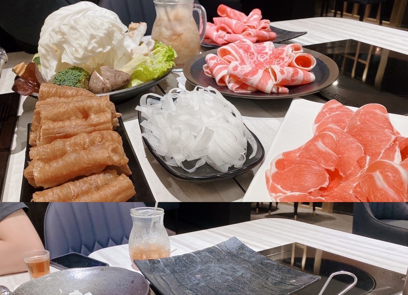 點了牛小排、霜降豬、老油條、手工蛋餃、綜合菜盤、綜合菇、蝦子蛤蜊雙拼,贈送冰沙1壺、茶凍、巧克力還有鮮奶茶,2個人吃超級飽。