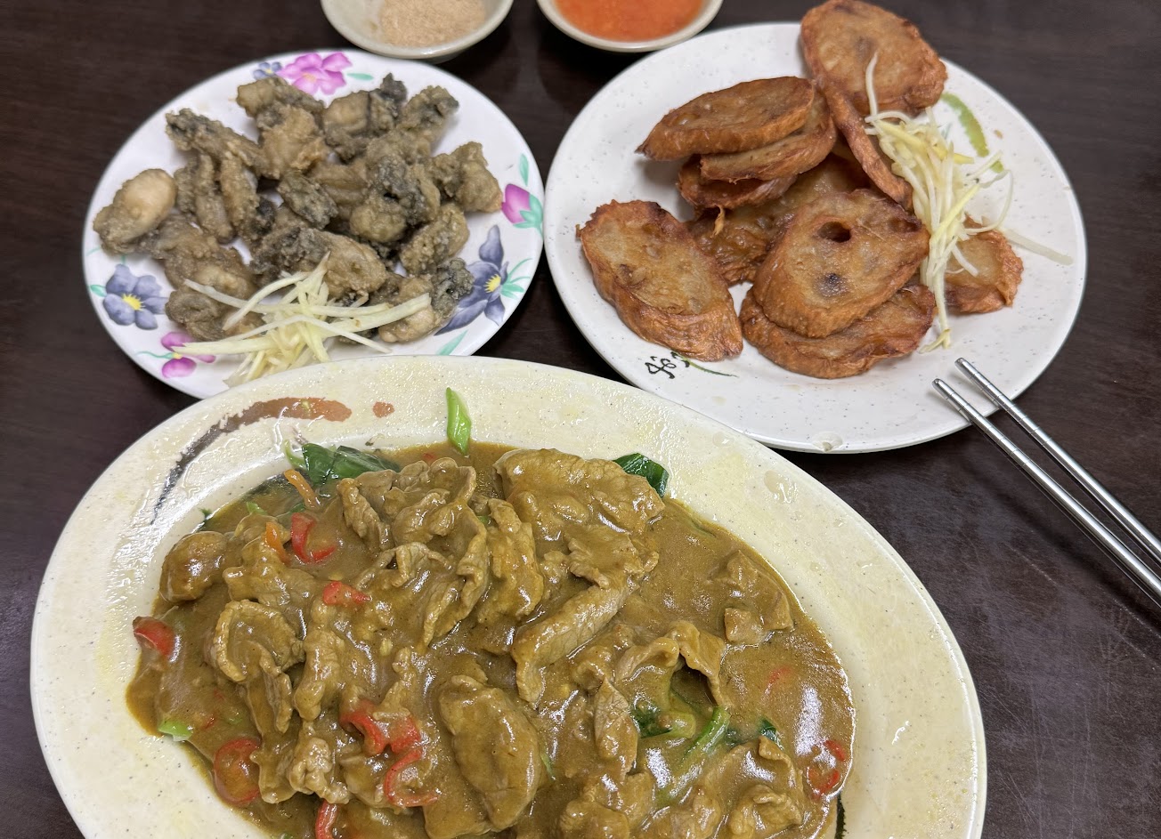看到評價好而來,但老實說非常普 1. 隱藏菜單咖喱炒羊肉大推 2. 鵝肉很柴不嫩,不要點 3. 紅燒鰻上菜不是現炸的,不酥且韌韌的,肉超級乾,非常不行 4. 青菜、小黃瓜、炒麵中規中矩,還行 5. 點的菜忘記上,蚵仔酥最後上,好膩 服務 內用 餐點類型 晚餐 餐點:3 服務:4 氣氛:3
