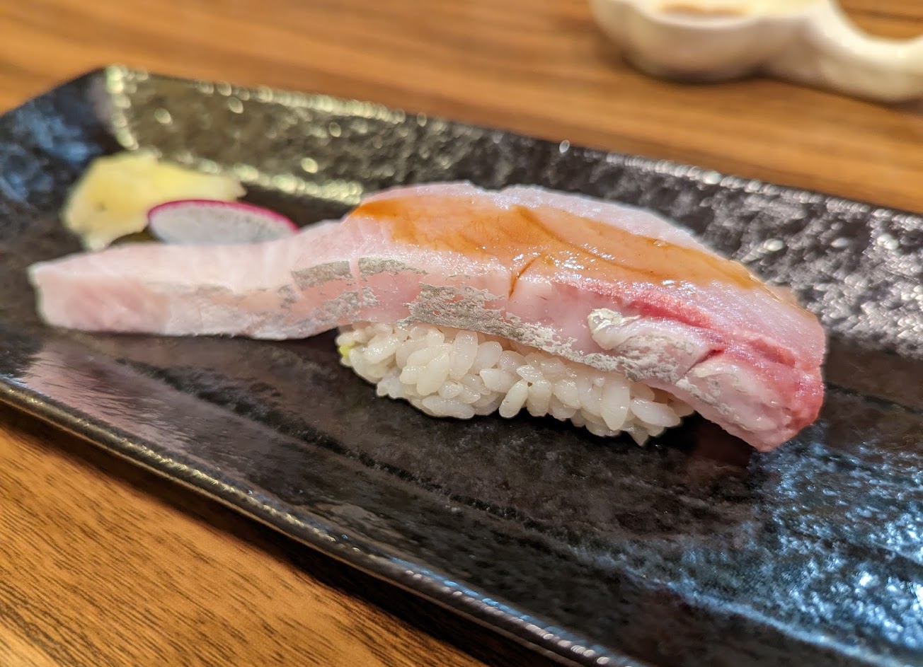 我在旗魚上吃到3片紅魽的鱗片 鮭魚的魚皮沒有去乾淨(黑色部分 上面刷的醬本身味道過重,加上醋飯本身好像是用魚翅羹在用的紅醋調味,坦白說整體搭配起來什麼魚我都吃不到魚肉的味道… 冬天又是紅魽很好吃的季節,我覺得這樣太可惜那條魚了