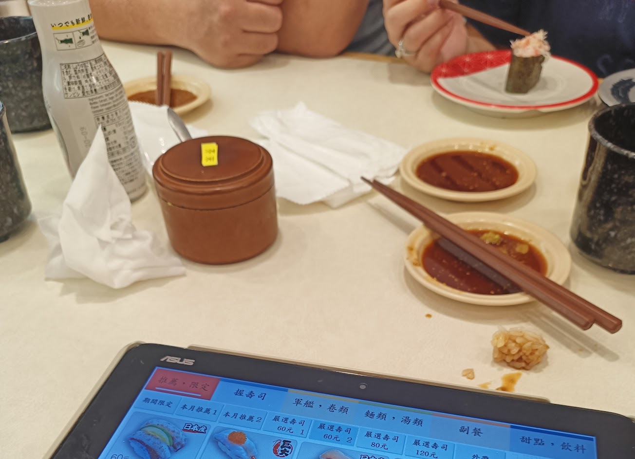 真的是最奇妙體驗迴轉壽司,明明自己平板在響,卻眼睜睜看自己點的壽司被前面桌拿走,很懷疑沒有顧客吵過架嗎?尤其肚子餓的時候。後來終於抓到大家節奏,大概就是你幫我點我幫你點的概念。握壽司也很奇葩,飯很容易散,轉盤上也會遇見肉飯分離的握壽司。有四種醬油口味,適合不同偏鹹偏甜需求的客人,這點覺得還不錯。