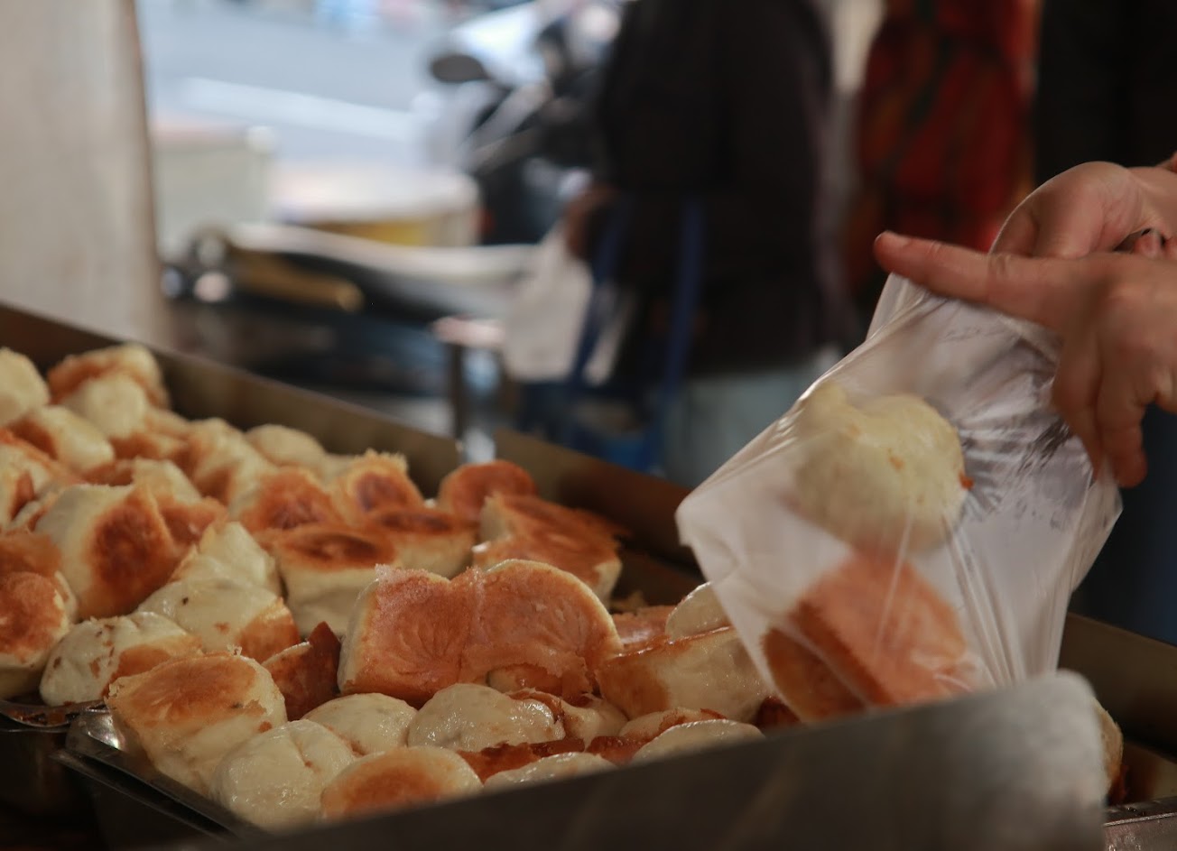 水煎包是該店主力產品,平價再搭配豆漿奶茶,有葷素之分,僅提供騎樓兩張桌子內用,大部分為外帶,經常大排長龍。