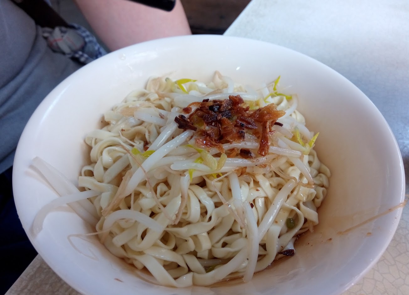 小小的麵店走過容易錯過 必須說介意店內環境就不要去了 乾麵25$ : 麵是基隆特有的扁麵條 沒有煮到全熟透 保留一些生硬度 只有簡單的紅蔥頭 餛飩湯25$: 湯頭是清湯帶有鹹味 有淋香油 餛飩有八顆 還不錯吃