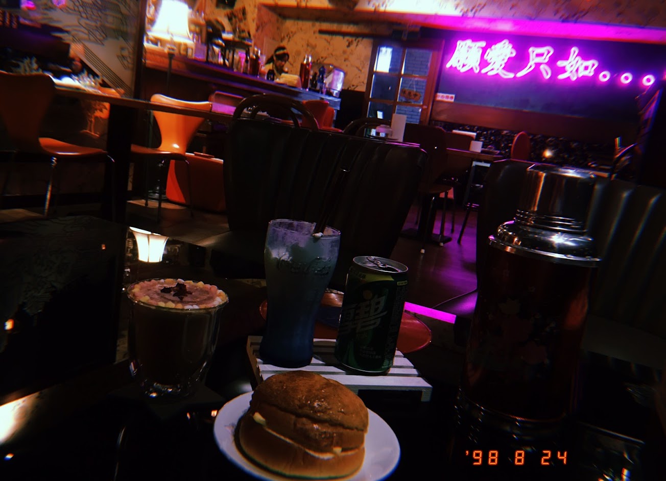 推開木門,馬上跳入不同世界,台港老物件混雜的擺設,略為昏暗燈光,物件反射著牆上霓虹字體「願愛只如⋯」的妖豔螢光粉紅色澤,整間咖啡店多了迷幻氣息,搭上絨布質感般華麗壁紙,紅色港味菜單,單看氣氛會誤以為是微醺小酒館。
