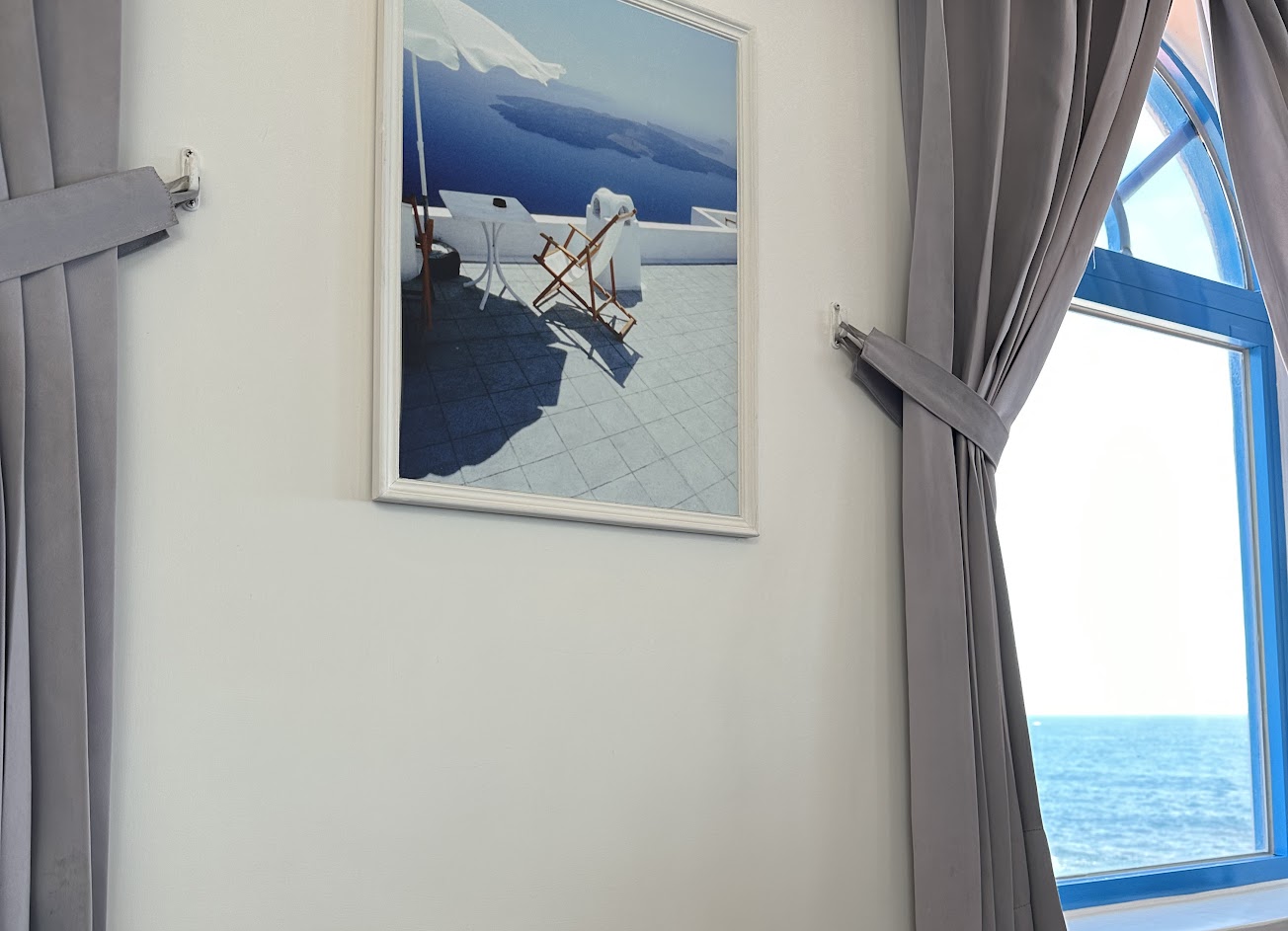 藍白裝潢設計,置身其中,宛如偽希臘;每一個玻璃窗看出去,都是一幅海闊天空美景。