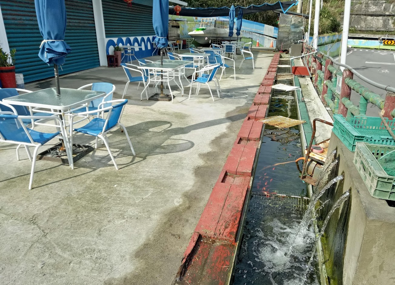 除了遙望基隆嶼的美景,餐廳裡面還有泡腳餵魚區、餵羊區,在等候餐點的同時,可以增添小屁孩的樂趣。今天寒流剛開始要發威,在14度的低溫下,大哥跟弟弟為了去腳的角質層、還是脫了鞋襪下去泡腳(果然屁股有三把火)