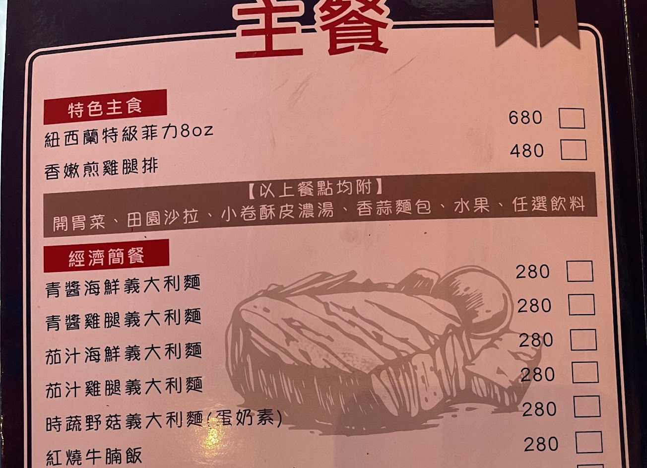 現在留下餐點是昂貴不好吃的牛排義大利麵炸物