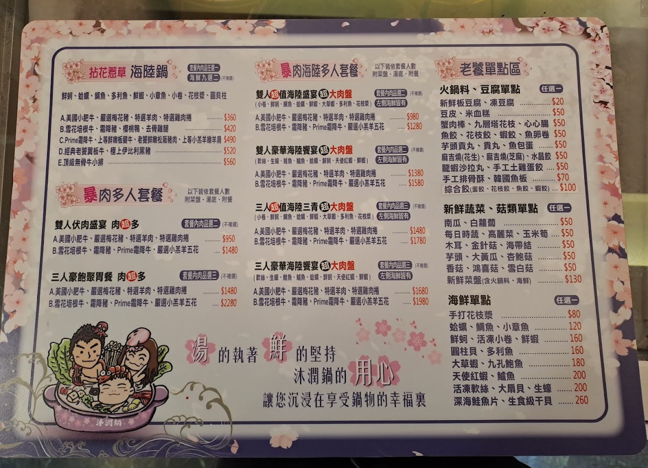 進門的時候服務人員的熱情招待,介紹湯底、點餐方式令人感到舒適以及愉悅,個人本次點的是紐澳特選羊肉XXL的份量,肉量不說是吃火鍋…我還以為我來到了吃到飽呢~哈哈!!如果吃不習慣較油的湯頭,店家還貼心附贈撈油的湯瓢可以做使用幫我們顧客的健康把關~很貼心吧❤~店內的調料算普通,但是有特製的醬料和和薄鹽醬油是令我感到最特別的~飲品的部分有20多種的飲料可以做選擇從小朋友愛喝的巧克力牛奶到青少年族群的氣泡飲品至較為健康的無糖飲品甚至想喝冰沙的他們也有喔!菜盤份量足夠並且有凍豆腐以及嫩豆腐可以做食用,冰淇淋的部分冰箱溫度掌控的不錯,不會像某些店家調整的太低導致很難挖取,整體來說算非常不錯的體驗下次還會再來的,再寒冷的冬天吃上熱騰騰暖暖的鍋物是再適合不過的事情了。