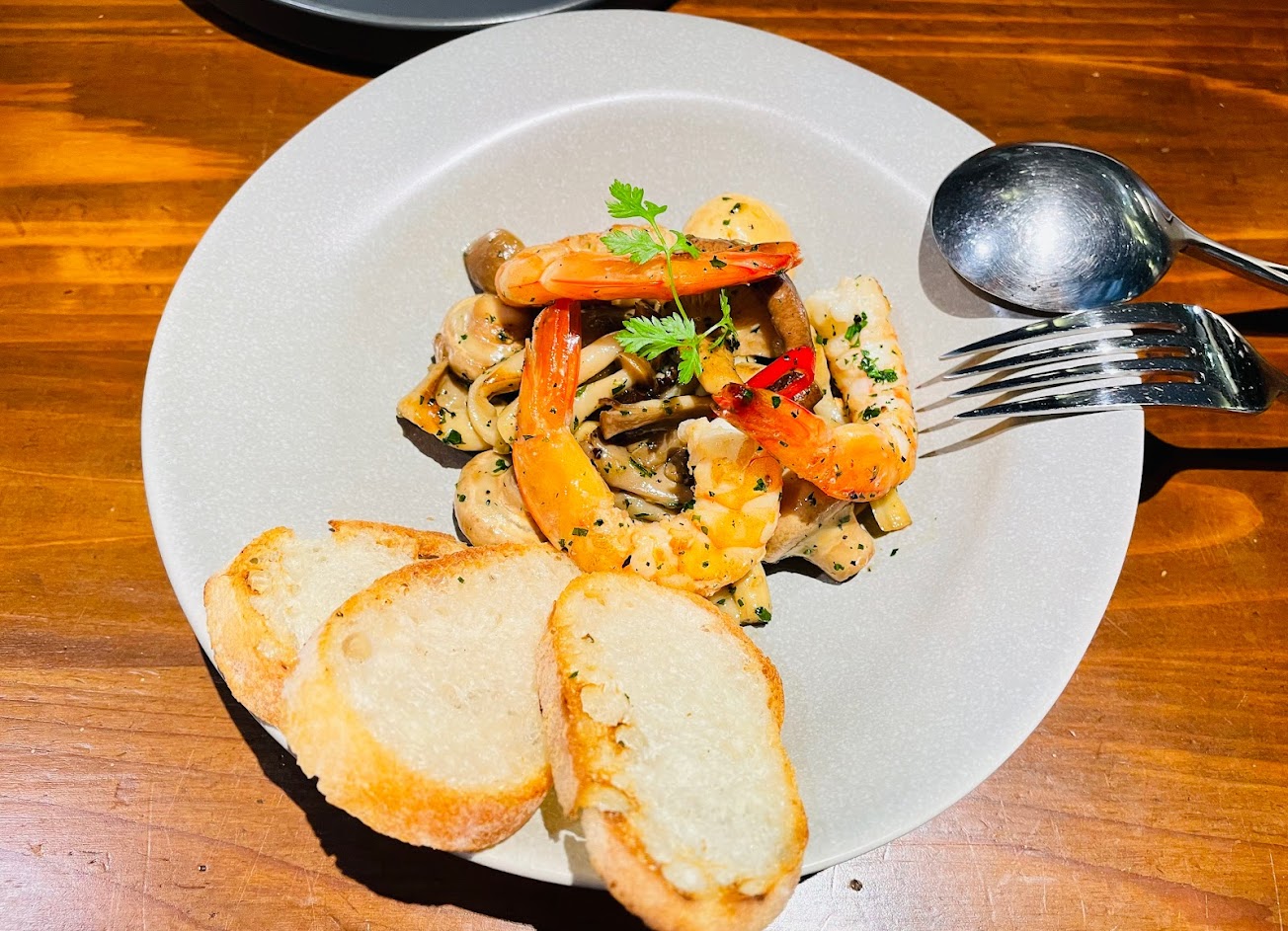 餐點: 一開始的餐前麵包就很驚艷,雖然很簡單的白麵包,但很有嚼勁 越嚼越香。 這裡是新義法料理,所以大部分餐點都是廚師的創意,食材的品質值得這個價錢 今天兩個女生選擇一個套餐搭配單點烤蔬菜&辣蝦義大利麵,這樣可以多嘗試不同餐點