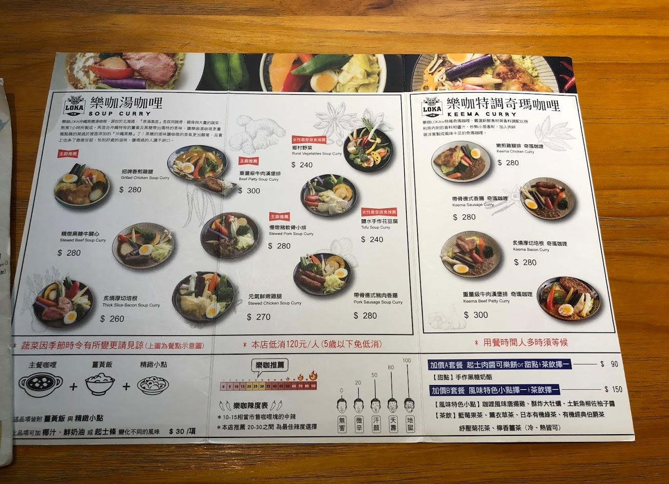 很喜歡店內原木桌。餐點咖哩蠻好吃的,是屬於湯咖哩,辣可分等級,如果不吃辣原味也很好吃。喜歡炸蔬菜三十元有好幾種蔬菜CP值滿高的單點菜色。吃完咖哩配上菊花茶很搭。炸牡蠣150元三顆稍微貴了點,如果依照這大小建議可以給五顆。