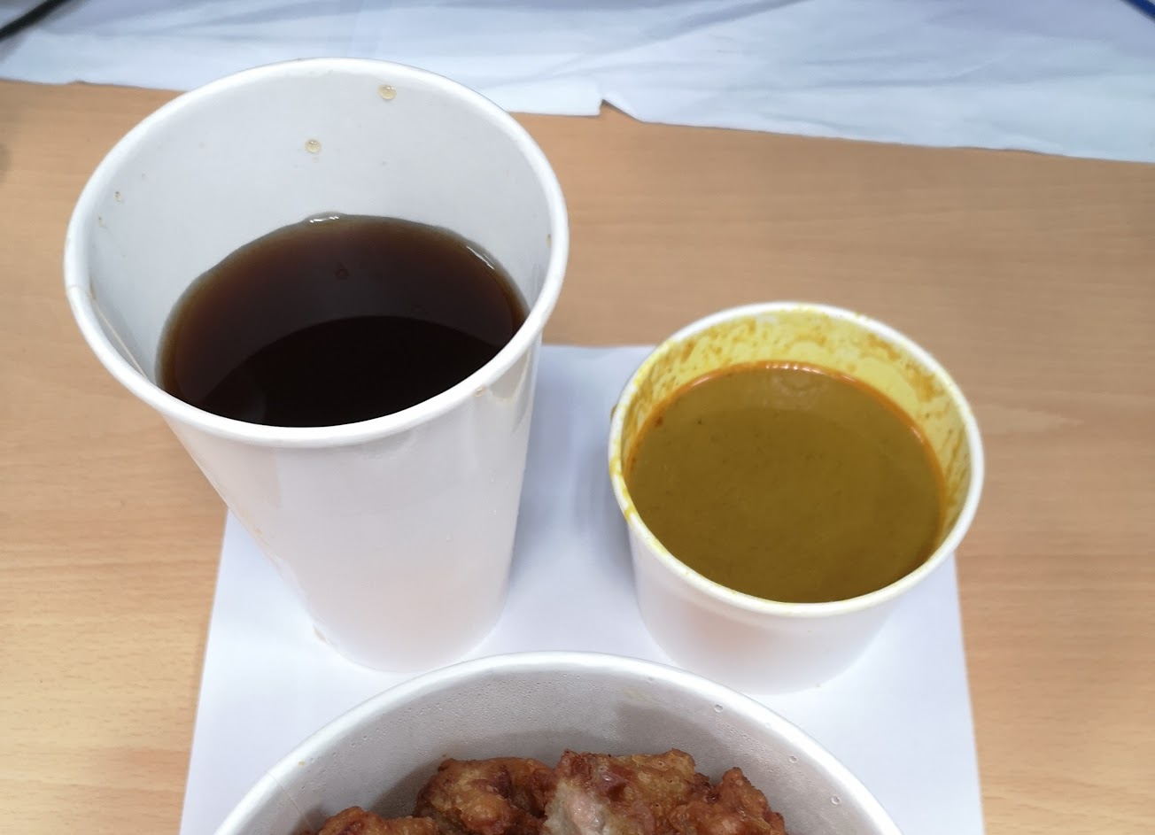 這次外帶黑紅辣味咖哩,老闆很用心,會問你何時取餐然後再算好時間幫你現炸製做餐點。所以買回家的唐楊雞咖哩沒有冷掉,跟在店裡吃的一樣超好吃的。紅茶是免費的,但也好喝很有水準。下次會再回訪嘗試看看原味的咖哩。