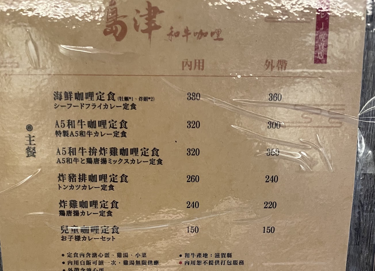餐點和牛拼炸雞咖哩飯 內用320 外帶280 以精華地段還有收費這用餐環境完全不可以, 可能因為沒收服務費吧,感覺沒在整理環境, 桌子蠻髒的然後用餐過程一堆蟲飛來飛去…