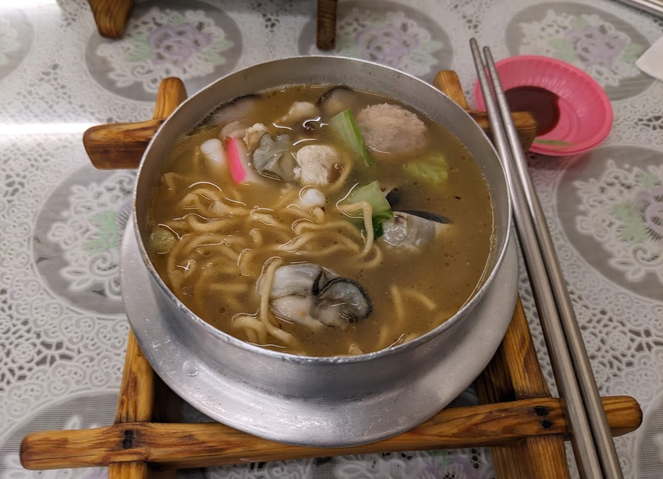 菜單大致分成粥類、麵類和湯類,再來就是蚵仔煎、煎虱目魚肚、各式川燙(蝦子、花枝、蚵仔、蝦仁),點餐後,餐具自取,同時拿沾醬和哇沙米。點了海產意麵、花枝粥、蚵仔煎和燙蚵仔,蚵仔太新鮮了,沾哇沙米好吃到爆,怎麼這麼鮮,海產意麵的麵是一種像炸過的麵條,口感不是我愛的,湯頭也吃不出什麼鮮味,但用料卻非常豐富,有各式海鮮,包括花枝、蝦仁、蚵仔、蛤仔、魚板和丸子,都非常新鮮,花枝Q彈,但無論是粥或麵都是小鍋燒,本人覺得麵量太少了?