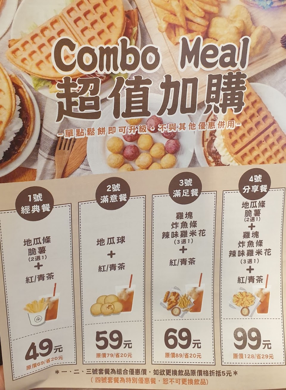 這家特色是經過門口有鬆餅味、聞到覺得幸福、門口可放雨傘、滿友善的對於下雨天要買鬆餅的客戶、但我覺得油炸的食物例如署條、雞塊就不用買了、大部份的人都是外帶、覺得等的時間比較久。但員工滿友善、會覺得對這城市有美化的效果、因為召牌顏色等等、都滿美的.