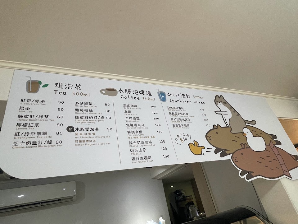 水豚胖胖的很可愛,餐點有義大利麵、飯類、點心,點主餐有送飲料或其他飲品折抵40~