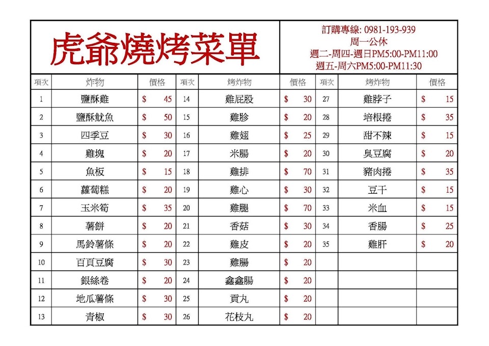 2024最新在地推薦餐廳的菜單_虎爺燒烤 烤雞排 鹽酥雞的菜單、圖片